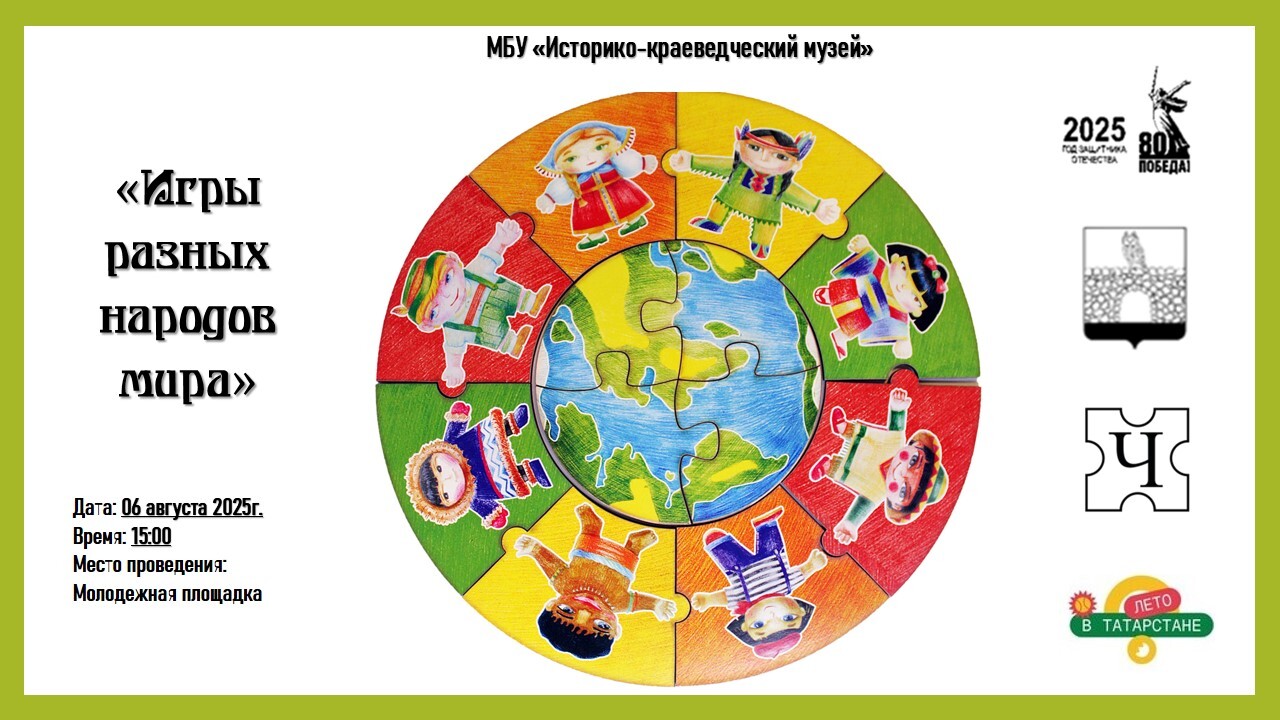 В рамках программы «Нескучные каникулы», «Лето в Татарстане» специалисты МБУ «Историко-краеведческий музей» приглашают юных жителей села на Молодежную площадку 6 августа в 15.00. Мы приглашаем вас окунуться в мир увлекательных игр и соревнований, представляющих культуру и традиции разных стран. В программе мероприятия вас ждут: народные игры, конкурсы, эстафеты и многое другое! Ждем вас!