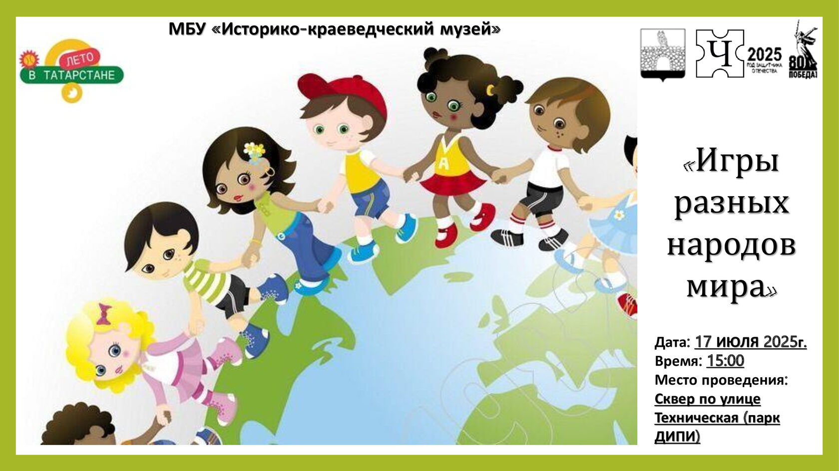Программа «Лето в Татарстане» – это замечательная инициатива, направленная на организацию досуга детей в летний период. Она позволяет ребятам не только весело провести время, но и узнать больше о родном крае, его культуре и традициях. Приглашаем всех юных любознательных ребят на игровое мероприятие "Игры разных народов мира"! Место проведения: с. Черемшан сквер по ул. Техническая 17 июля 15:00.